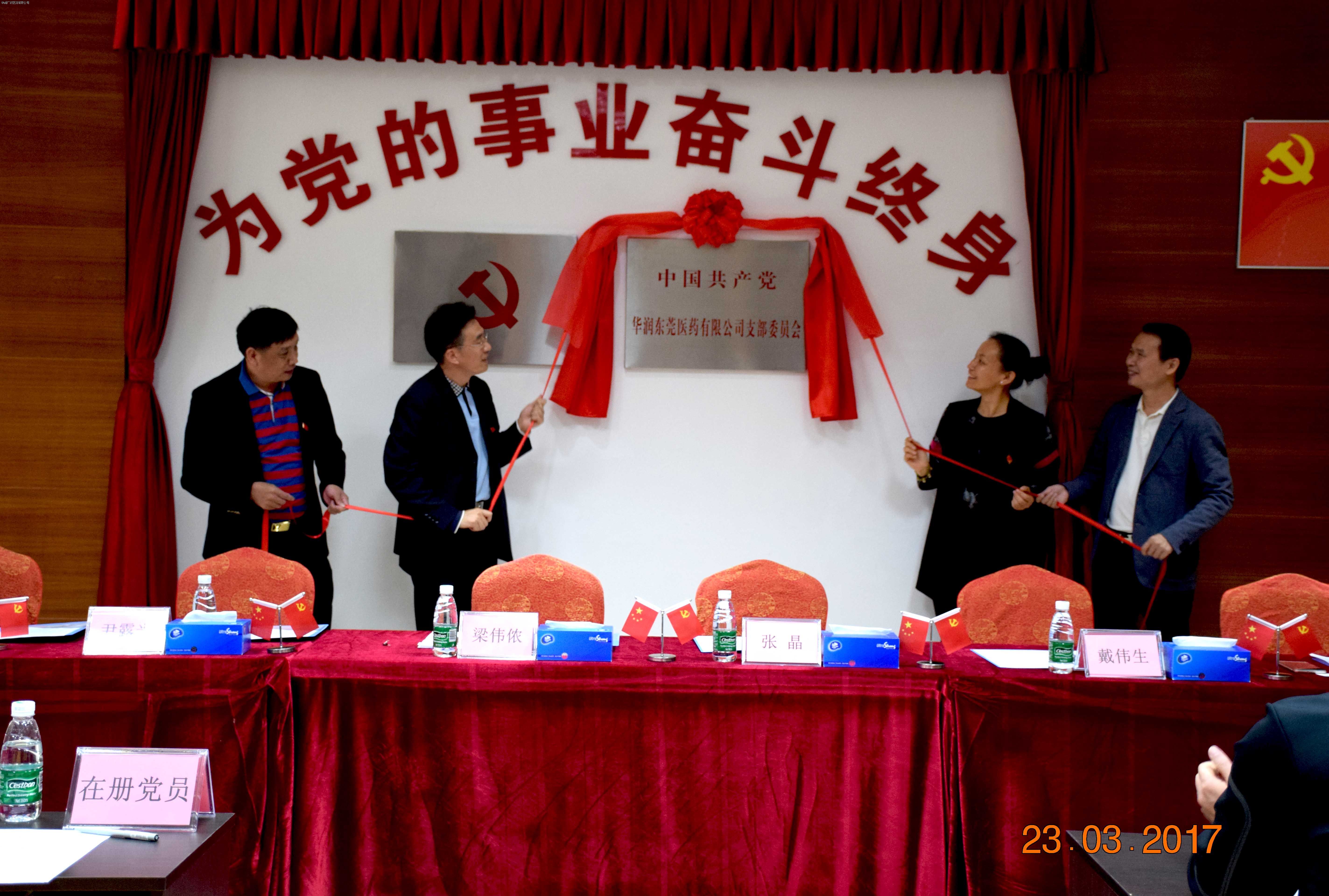 2017年3月23日上午,華潤東莞醫(yī)藥有限公司(以下簡稱“華潤東莞醫(yī)藥”)在黨員活動(dòng)室舉辦黨支部揭牌儀式并召開黨員選舉大會(huì)。寮步鎮(zhèn)鎮(zhèn)委委員梁偉儂、寮步鎮(zhèn)西溪村黨工委書記尹露光、寮步鎮(zhèn)社會(huì)組織工委副書記鄺紹坤、華潤廣東醫(yī)藥有限公司紀(jì)檢委員張晶、華潤東莞醫(yī)藥總經(jīng)理戴偉生等領(lǐng)導(dǎo)共同出席活動(dòng)。本次活動(dòng)由華潤東莞醫(yī)藥顏加進(jìn)同志主持,公司全體黨員及公司全體中、高層管理人員,華潤廣東醫(yī)藥黨務(wù)工作者作為列席嘉賓出席本次活動(dòng)。