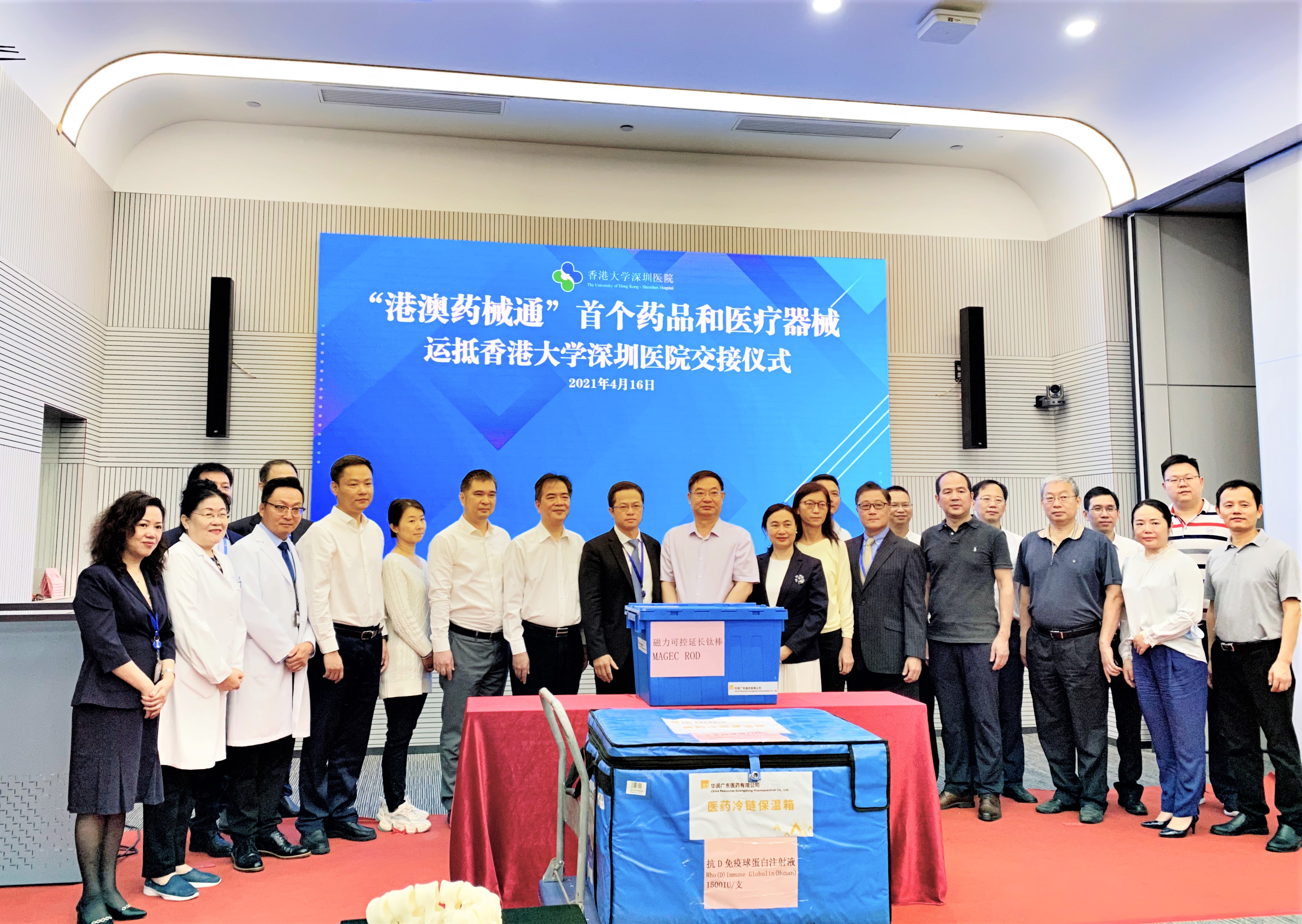 2021年4月16日上午九點(diǎn),香港大學(xué)深圳醫(yī)院(以下簡稱:港大深圳醫(yī)院)和華潤廣東醫(yī)藥有限公司(以下簡稱:華潤廣東醫(yī)藥)正式交接“港澳藥械通”首個藥品(抗D免疫球蛋白注射液)和醫(yī)療器械(磁力可控延長鈦棒)。